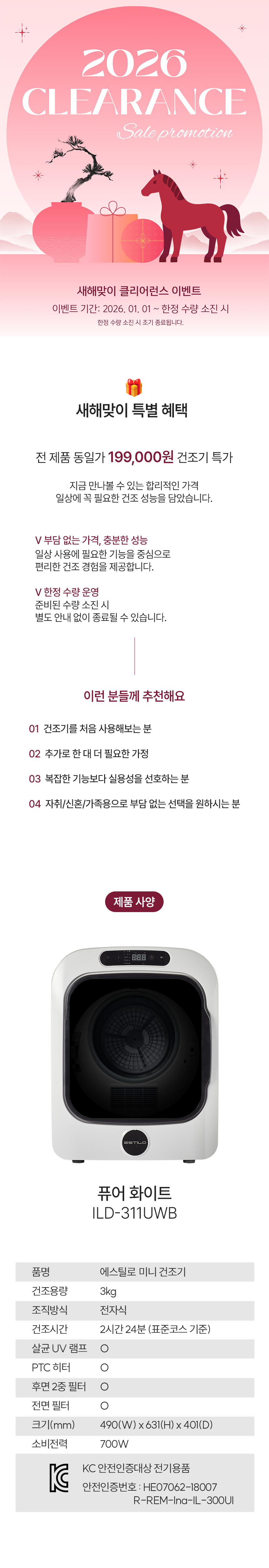 [클리어런스] 에스틸로 미니건조기 사각도어 퓨어 화이트 소형 1인 미니 자취 원룸 건조기
